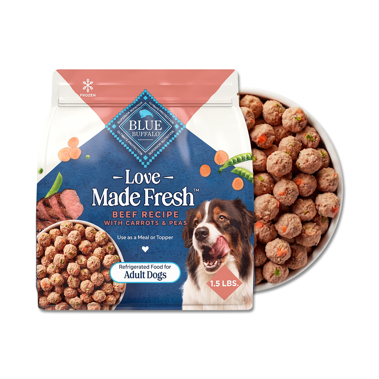 Crafted with real beef, delicious carrots & peas, and cooked to perfection. Blue Buffalo Love Made Fresh refrigerated meatballs for adult dogs come in an easy-to-reseal pouch. They're a ready-to-serve way to elevate mealtime. Plus, they can be served on their own or as a dog food topper, making meals flexible & delicious.